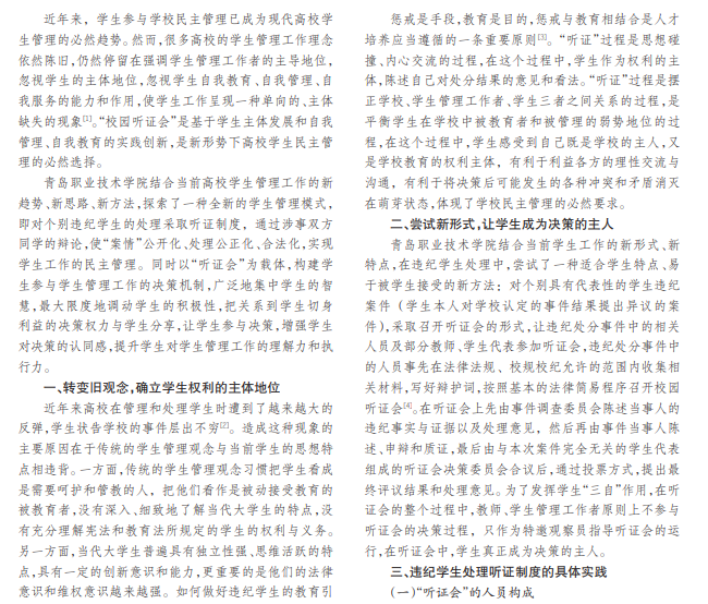 根据当代大学生独立意识、民主意识、法制意识较强的特点,本文以青岛职业技术学院为例,探索了一种 全新的学生管理模式,对个别违纪学生的处理采取听证制度,以“听证会”为载体,构建学生参与学生管理工作的决策机 制,增强学生对决策的认同感,让学生成为决策的主人,提升学生对学生管理工作的理解力和执行力。