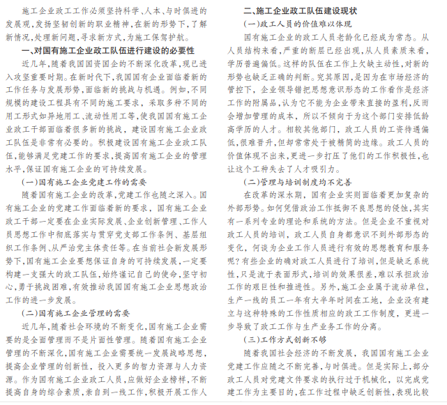 在改革的深水期,国企面临的挑战愈加严峻,矛盾愈加尖锐。施工企业作为国有企业的重要组成部分,如何 在思想意识形态上实现“精兵强将打胜仗”,取决于政工队伍的建设。本文从现状和对策两方面进行探讨,意在推动国有 施工企业政工队伍整体质量的提升。
