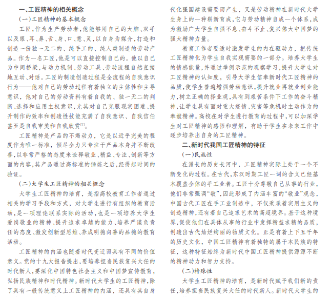 将工匠精神与学生的教育工作有效地结合起来,是当下大学教育发展的需要。新时代下大力培养学生的工 匠精神,是培养富有创造精神、充满活力人才队伍的需要,是稳步提升我国经济发展的持续动力。本文从工匠精神的概 念入手,探究当代教育下大学生的工匠精神,以实现大学生工匠精神培养的目标。
