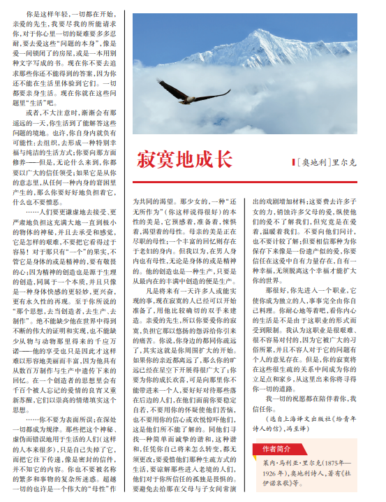 你是这样年轻,一切都在开始, 亲爱的先生,我要尽我的所能请求 你,对于你心里一切的疑难要多多忍 耐,要去爱这些“问题的本身”,像是 爱一间锁闭了的房屋,或是一本用别 种文字写成的书。现在你不要去追 求那些你还不能得到的答案,因为你 还不能在生活里体验到它们。一切 都要亲身生活。现在你就在这些问 题里“生活”吧。