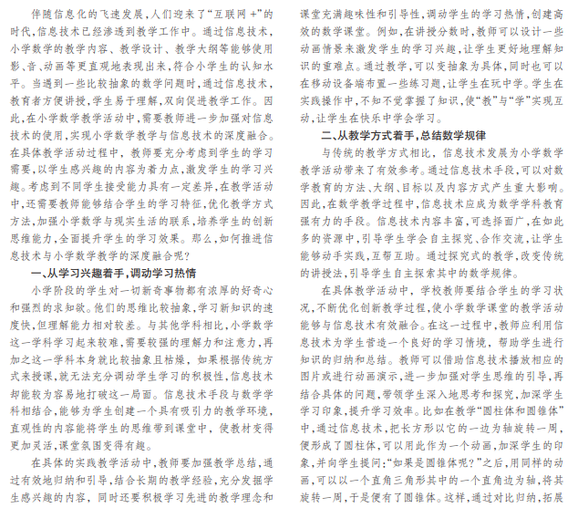 21世纪,信息技术在我们的生活中已经随处可见,给人们的学习与工作带来了许多改变。信息技术让生活 变得简单,让学习变得有趣,让工作变得高效。在此大背景下,加之教学的不断改革与新课标的要求,教学模式与教学方 法也有了不一样的要求。当信息技术碰到小学数学,会使学生产生不一样的火花思维,有助于提升教育工作者的教学水 平。基于此,本文就小学数学教学和信息技术的融合进行研究讨论,提出相应的教学建议以供参考。