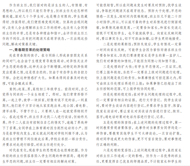 受当今社会形势的影响,班主任的工作越来越难做,遇到的问题也越来越棘手。学生早恋、网游、与老师起 冲突、自杀、群架、敲诈勒索、离校出走等问题层出不穷,稍有不慎就将自己卷入风口浪尖。尤其是年轻的班主任,如果遇 到学生问题处理不当,有可能造成学生家长、学校、学生都不满意的结果,在身心疲惫的同时,也有可能影响自身安全, 伤害自身的职业道德。笔者根据多年班主任经验,提出解决学生问题的对策。
