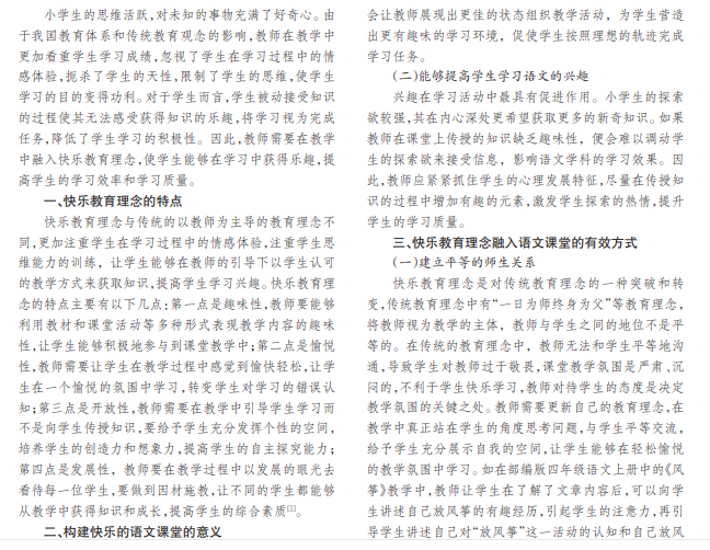 为了全面提高小学语文教学质量,教师需要在教学中融入快乐教育理念,用学生喜闻乐见的方式引导学生 学习,提高小学生的学习兴趣,促进小学语文教学的改革。