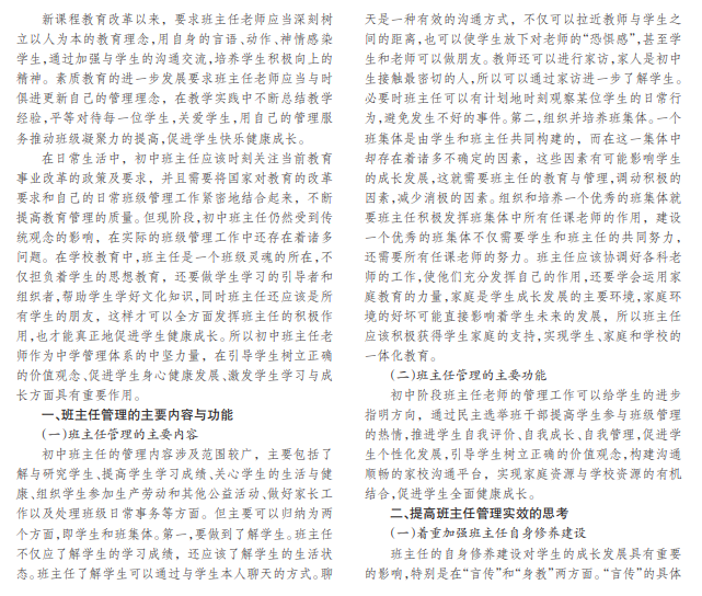 初中是学生由儿童期向青年期转变的重要阶段,这一阶段是学生成长发展的关键时期。初中班主任作为 班级活动的组织者与管理者,更应该重视班里学生的成长情况。作为初中班主任,除了在班级中组织日常教学活动及班 级建设等常规任务外,还应该注意班里学生的情绪状态,在必要时提供帮助,帮助他们解决所遇到的心理问题和实际问 题。随着国家素质教育的深入发展,逐渐要求班主任老师应当以学生为主体,增强学生的主人翁意识,构建和谐融洽、民 主平等的师生关系,达到全面提升学生综合素质的教育目的。本文从现在初中班主任的管理现状出发,创造性地提出了 一些策略,希望借此研究课题对初中班级管理工作起到一定的作用,也希望对提高班级凝聚力有所裨益。