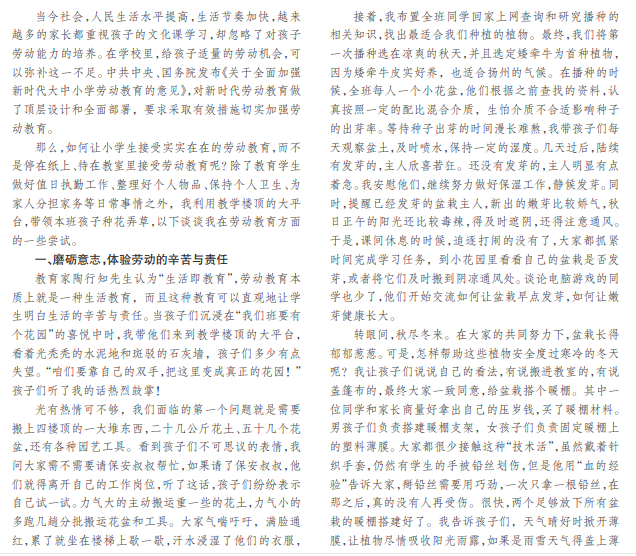 劳动教育是新时期党对教育的新要求,是中国特色社会主义教育制度的重要内容。为了突出劳动教育重 点,我组织学生打造班级花园,实实在在地劳动,以体力劳动为主,让学生在劳动中出力流汗、接受锻炼、磨砺意志,学会 感恩分享,强化责任担当,切切实实地感受到劳动的意义和价值,从而爱劳动、会劳动、乐于劳动,传承和弘扬中华民族 优良传统,做担当民族复兴大任的时代新人。
