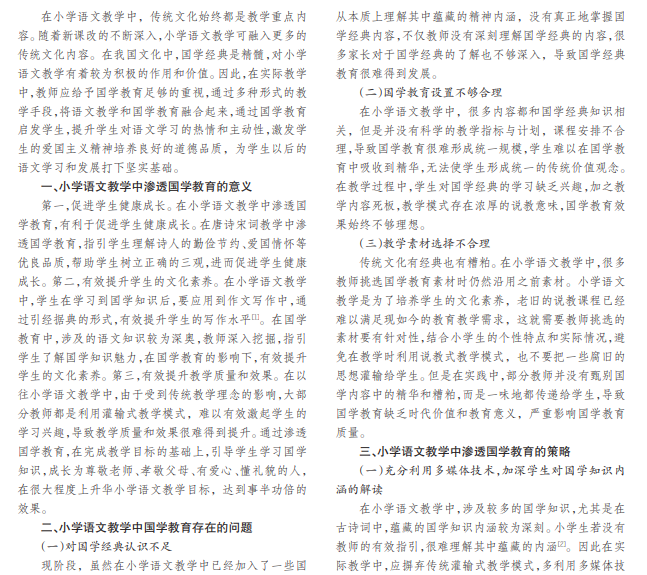 国学突出了中华文化的博大精深和源远流长,是中华优秀传统文化的精髓。在小学语文教学中渗透国学教 育,可以使中华优秀传统文化得到更好的传承和弘扬,还可以有效提升学生的审美情趣和人文素养。本文对小学语文教 学中渗透国学教育的策略进行深入分析,希望可以有效提升教学质量,促进学生语文综合素养和能力的发展。