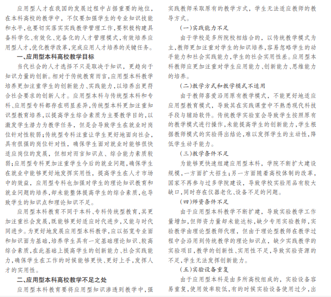 在我国教育的发展过程中,本科高校要不断深化教学改革,培养社会所需的应用型人才,发挥教学管理的 优势作用和价值,提高学生的综合能力和素养。文章分析应用型本科高校教学的管理机制,提出进一步改善管理形式、 优化具体细则,促使其不断散发出更具价值的教育意义。