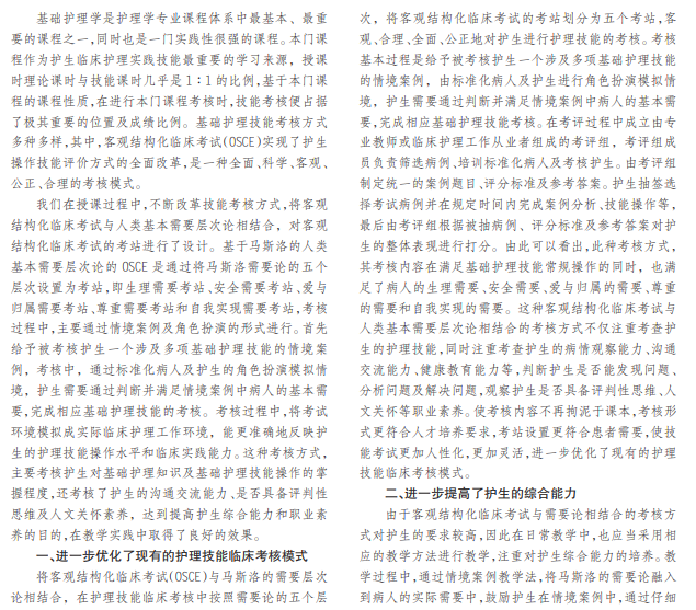 在护理技能教学中,技能考核是其中非常重要的教学环节,技能考核方式众多,而客观结构化临床考试 (OSCE)较为客观。基于需要论的 OSCE是将马斯洛的需要论的五个层次设置为客观结构化临床考试的考站,通过此种考 核方式,可以在考核护生基础护理知识与技能的基础上,提高护生的技能操作水平、发展护生的评判性思维,提高护生 的职业素养及人文关怀素养、培养护生的病情观察及健康教育等综合能力。