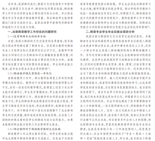 在我国小语种教学工作中,韩语教学工作的难度相对较小,韩语教学通常是为了提升学生的韩语运用能 力,使之在职业场景中能够更加自如地进行韩语交流。本文主要就韩语教学工作中的主要问题进行分析,探讨在韩语教 学中积极运用职业能力导向力量进行优化的策略。