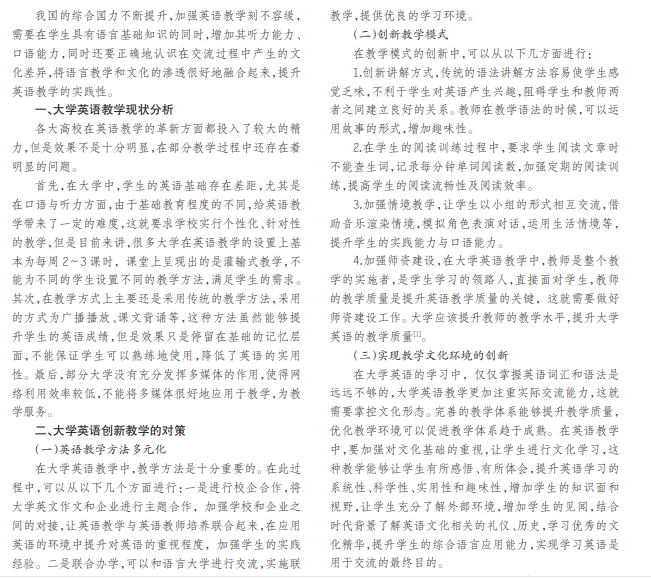 英语是世界性的通用语言,应用广泛,要想走向国际就需要具备良好的英语基础。大学英语的学习需要在 掌握基础教材知识的前提下,提升学生的听说能力,让学生能够利用英语进行流利的交流,提升英语教学水平,满足国 家对英语人才的需要,本文就大学英语创新教学措施进行了分析。