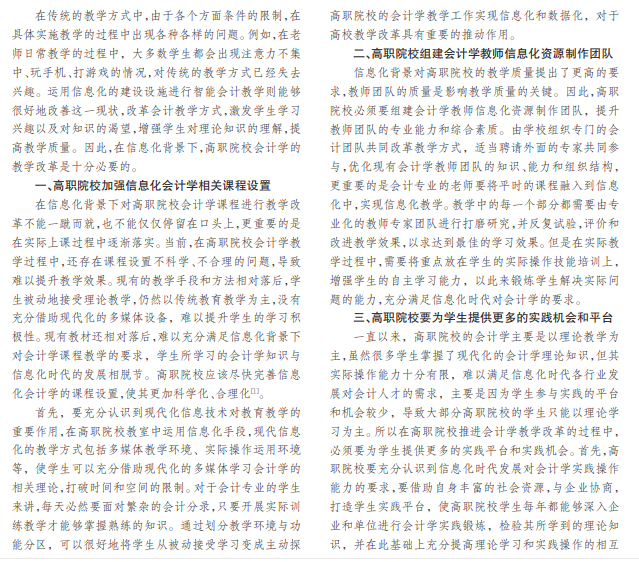 随着我国市场经济的不断发展,国民生活水平得到了显著提高。在信息化的背景下,教育改革显得尤为重 要。在高职院校的会计教学中也需要运用新的教学方式,适应社会的变化发展。新的教学手段、新的教学方法只要运用 得当就会提高教育水平,信息化建设背景下完善会计教学具有非常重要的意义,不仅能够帮助学生加深对知识的理解, 还能够增强学生的团队合作能力,更好地适应未来生活。本文将对信息化背景下高职院校会计学的教学改革进行研究。