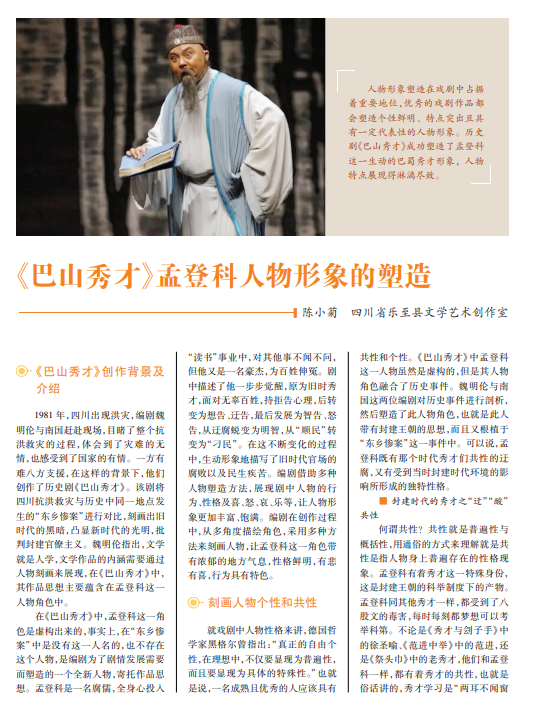 人物形象塑造在戏剧中占据 着重要地位,优秀的戏剧作品都 会塑造个性鲜明、特点突出且具 有一定代表性的人物形象。历史 剧《巴山秀才》成功塑造了孟登科 这一生动的巴蜀秀才形象,人物 特点展现得淋漓尽致。