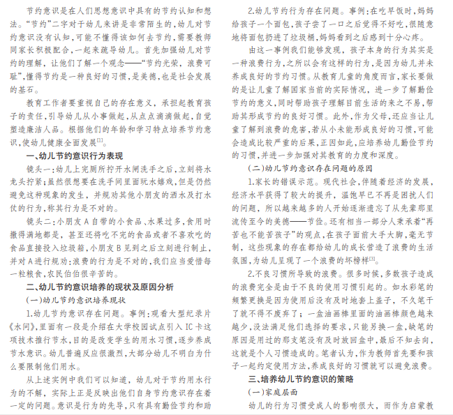 本文着重对“幼儿节约意识的培养”展开讨论,在具体的研究过程中,分析了培养幼儿节约意识的意义、幼 儿节约意识培养的现状以及培养幼儿节约意识的策略,建议联合家长和教师一起解决幼儿的浪费问题。