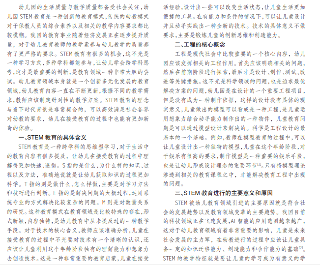 学龄前儿童的教育随着社会的发展越来越有小学化倾向,家长都不希望自己的孩子落在基础教育的后面, 所在幼儿教育培养过程中让孩子学习基础教育的内容,这是幼儿教育需要关注的问题之一。幼儿教师的职业素养在新 时代的背景下有了更多的提升空间,幼儿教育有了新的需求,相关的教学内容也应该有一定的改变。对于教学模式,教 师也应该有更多的思考和创新,结合幼儿的年龄特点和学习特点,需要整合相关的教育内容。本文将对幼儿园 STEM教 育的实践和思考进行重点探讨分析。