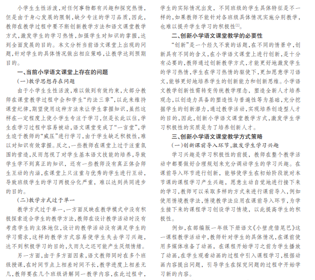 语文学科贯穿学生的学习生涯,小学阶段是语文学习的初始阶段,这一阶段,教师应该注重学生对语文学 习的兴趣和热情,通过科学合理的教学方式激发学生学习的积极性,使学生通过语文学习收获审美体验,促使学生全面 发展,为以后阶段的学习打下坚实基础,成为社会建设需要的人才。