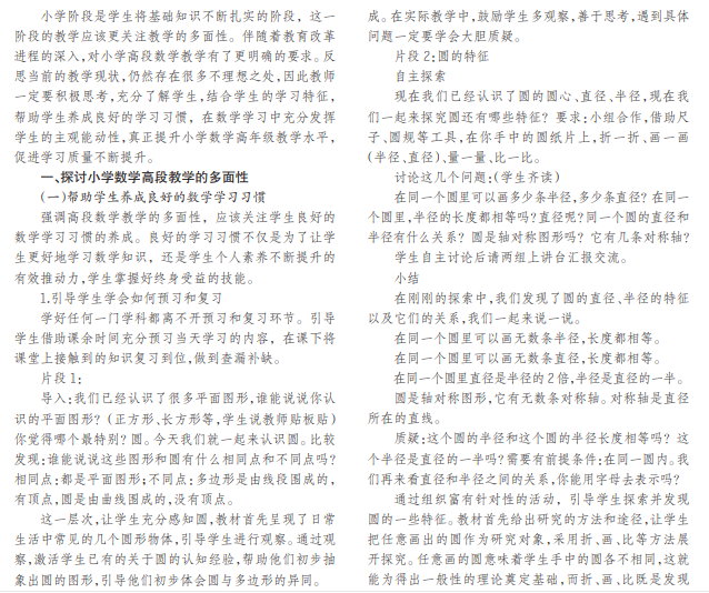 小学阶段是素质教育的起始阶段,也是一个人正式系统地接受学校教育的阶段。数学是小学教育阶段的必 修学科,该学科的特征是逻辑性以及思维性。特别是高段数学教学,对学生提出了更高要求,保障小学数学高段教学质 量,应该关注教学的多面性,更好地帮助学生学习好数学知识,学会运用学过的数学知识分析和解决实际问题,使小学 数学知识与初中数学有效衔接,注重教学的多面性,强调知识内容的不断拓宽,让学生成为高素质人才。
