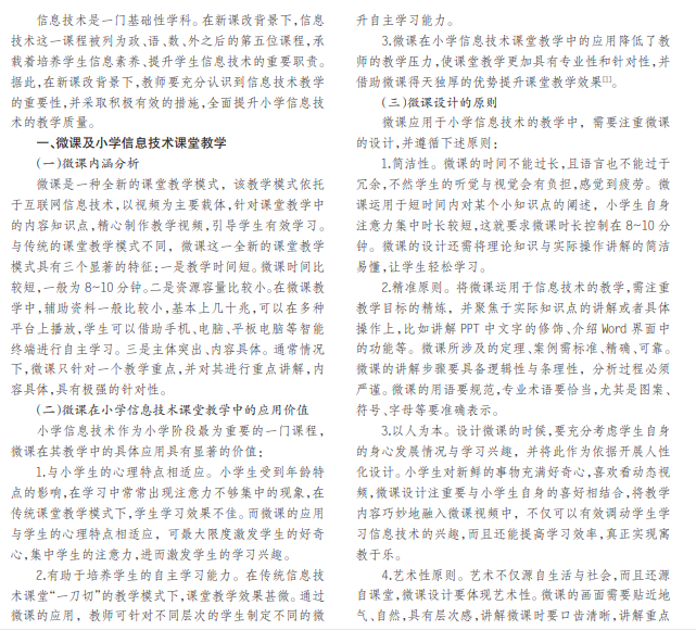为了进一步提升小学信息技术课堂教学质量,培养学生的信息素养,教师需要借助微课这一新兴的课堂教 学模式,将其应用到信息技术课堂教学中,提升小学信息技术课堂教学效果,培养学生信息素养。本论文立足于小学信 息技术教学,对微课在其教学中的具体应用进行了详细的研究和分析。