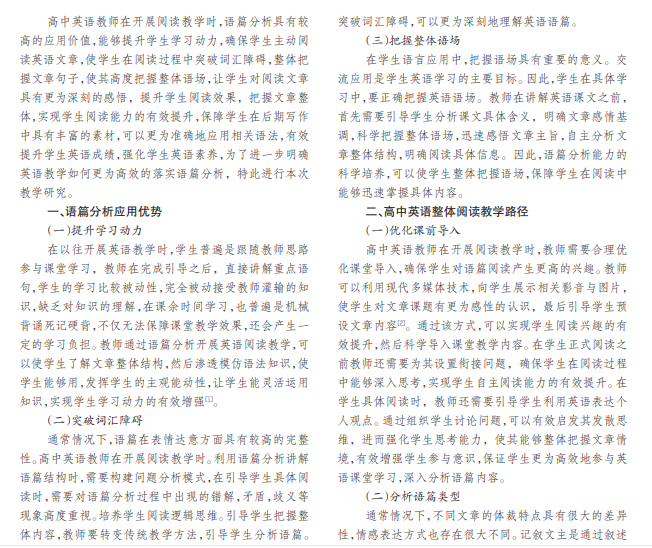 在开展高中英语教学时,阅读教学是教育工作的重点内容,教师必须对其加强重视,深入分析教学需求和 学生整体情况,确保有效提升教学效果。在此过程中,语篇分析具有较高的应用优势,可以使学生整体把握文本内容,强 化学生语言把握能力。本文首先分析语篇分析的应用优势,然后从课前导入,语篇类型,阅读策略和知识体系四个角度 综合探究应用语篇开展英语阅读教学的具体策略,希望高中英语教师能够更为高效地开展教学活动。