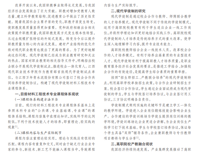 改革开放以来,我国职教事业取得长足发展,党和政府重视发展职教,我国职教在技术人才培养方面面临 课程建设的问题。新工业革命引发制造业转型的背景下,我国职教课程建设改革更加紧迫,从产教融合现代学徒制人才 培养模式角度探索构建材料工程技术专业课程体系路径非常重要,以提升岗位的技术技能为目标,以突出实践性教学 为主体,将各岗位所需理论知识融入生产实践中,通过校企合作的模式共同建立以“基础能力 +专业能力 +岗位能力” 为特征的现代学徒制课程体系。