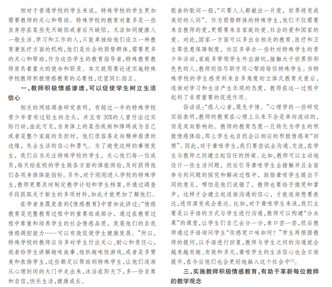 特殊教育学校是一个国家教育的重要组成部分,教育对象主要是各类残障人群,年龄也是各有出入,包括 听障、视障、智障等类型的学生,这些学生群体大部分都是缺乏自理自立能力的,其中有的学生在经过一段时间的教育 和辅助治疗之后可以达到自理效果,而有些则不能,身体上的各类缺陷也常常会使这些学生衍生出心理方面的障碍。对 此,作为特殊学校的教师有责任通过渗透积极的情感融化特殊学生“冰冻”的心灵。