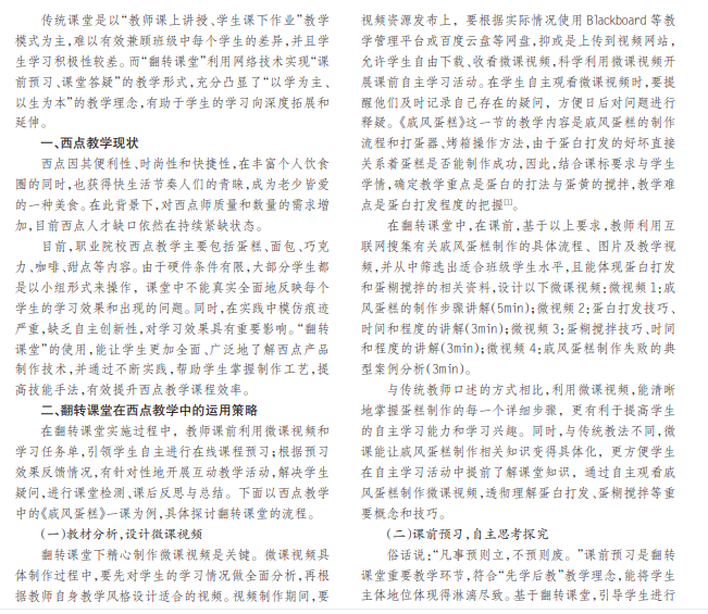 “翻转课堂”是对传统课内外时间教学模式的一种颠覆,其实质是将学习的决定权和自由权由教师 交还给学生,让学生自由和自主探究、思考与讨论,有利于促进学生主动性和积极性的形成,增强学生对教学知识 的理解与运用能力,最终实现“师生协同”发展的目标。下面将针对翻转课堂在职业院校西点教学中的运用策略进 行具体阐述。