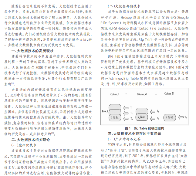随着我国大数据技术的不断发展,大数据技术已经深入到各个领域。我国社会经济的发展将会带动人们 生活水平的提高,大数据行业的创新将会为我国大数据时代带来更大的机遇和挑战。本文分析了我国大数据技术存在 的问题,并针对具体问题提出应对策略,为今后的发展提供借鉴。