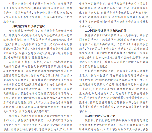 中职数学是中等职业学校中关键性的基础课程,不但和社会实践、日常生活有紧密的联系,还是学好其他 专业课程的前提。中职数学和专业课教学融合能够更好地为专业课服务,适应学生日后的职业生涯,有利于学生从实际 出发提升自身的水平,进一步改进和完善现阶段课堂教学模式,改善现阶段中学数学教学状况,满足职业教育的发展需 求。要想结合中职数学和专业教学,需要改进和完善教学活动,本文对此方面进行了分析。