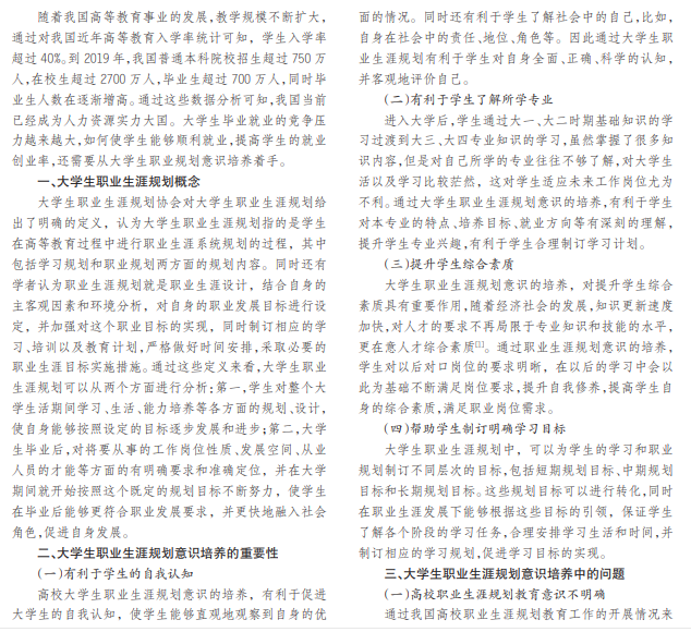 我国人口众多,因此大学生数量相对来说比较多,特别是随着高校扩招,大学生毕业后就业难问题凸显,很 多学生毕业后面临巨大压力,在就业方面很迷惘。针对大学生的这种情况必须要在高校中加强对学生职业规划意识的 培养,使学生在就业前能够树立符合自身的职业理想。本文主要对大学生职业规划意识的培养进行分析。