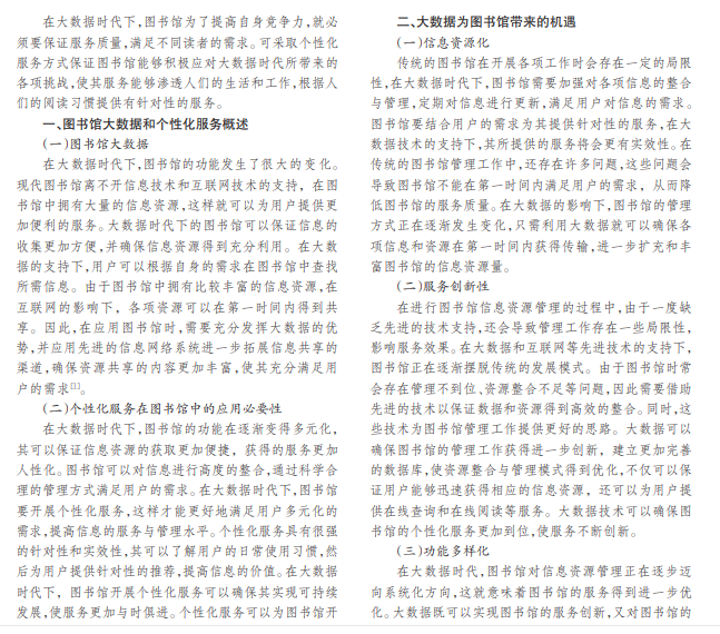 随着时代不断发展,图书馆会面临激烈的竞争,尤其在大数据技术的支持下,图书馆若要提高服务质量,就 要吸取大数据的优势,采取有效的服务方式,为广大人民群众提供个性化服务。当前,大数据已经渗透到了各个领域,因 此,大数据技术的应用势在必行。在大数据时代下,图书馆需要通过个性化服务展现出服务特色和优势,解决现阶段存 在的问题。
