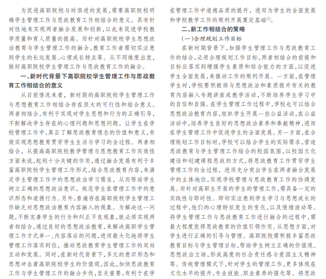 在新时代背景下,事业教育取得一定的进步和发展,这对高职院校学生管理工作和思政教育工作提出更高 要求,强调学生管理与思政教育工作之间存在相通性,要尽可能挖掘和寻找学生管理工作与思政教育工作的结合方式, 以此来更好促进高职院校顺应时代的变化发展趋势,通过两者结合,培养出更多高素质的人才。