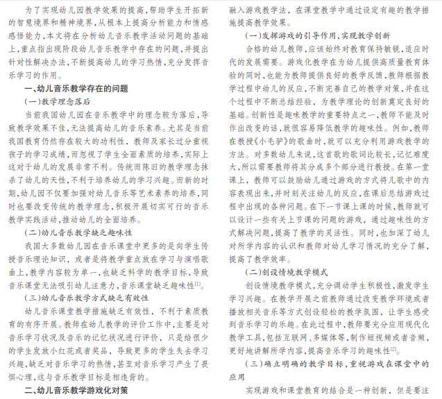 随着素质教育的深入,艺术类学科在教学中的重要性不断提高,幼儿阶段作为艺术素养培养的极佳时间 段,在幼儿教学中提高音乐教学效果非常关键。由于幼儿阶段的特殊性,游戏能够最大限度吸引他们的兴趣。为此音乐 教学的游戏化,对于提高音乐教学效果有着积极作用。