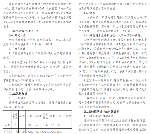 随着社会的发展,体育课堂教学中篮球模块越来越重要。我国各普通高中学校都积极开设篮球模块的选修 课,给学生提供了更为专业的学习篮球的平台。本文对高中篮球学习的现状进行了简要的分析,进而根据篮球教学的模 块目标、学生的实际情况以及资源的运用进行了篮球模块教学的设计,以此来提高高中篮球选项学生的篮球方面的知 识以及运动技能。