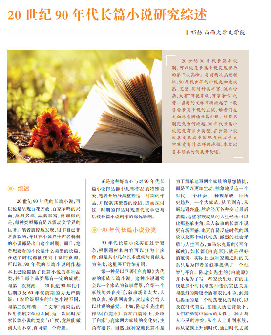 20世纪 90年代长篇小说 潮,可以说是长篇小说发展经历 的第三次高峰。与前两次热潮相 比,90年代出品的小说更加地成 熟、完整,同时种类丰富,流派纷 杂,大有“百花齐放,百家争鸣”之 势。当时的文学市场掀起了一股 售卖长篇小说的主流,读者们也 更加愿意阅读长篇小说。这股热 潮究竟为何掀起,90年代长篇小 说究竟有多少类型,在长篇小说 发展史及在中国现当代文学史 中究竟有什么样的地位,本文以 基本经典为例展开论述。