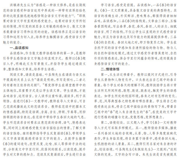 散文作为文学体裁之一,其清新明丽的措辞构词、简洁质朴的语言表达、情真意切的语言流露,使得散文语 言欣赏成为散文教学中的重要角度。散文教学中的语感培养对学生感受、欣赏、运用语言文字的能力起到重要作用。本 文旨在从品读感知、情境体悟、积累实践三方面,以散文作品《春》为例,简析散文教学中的语感培养。