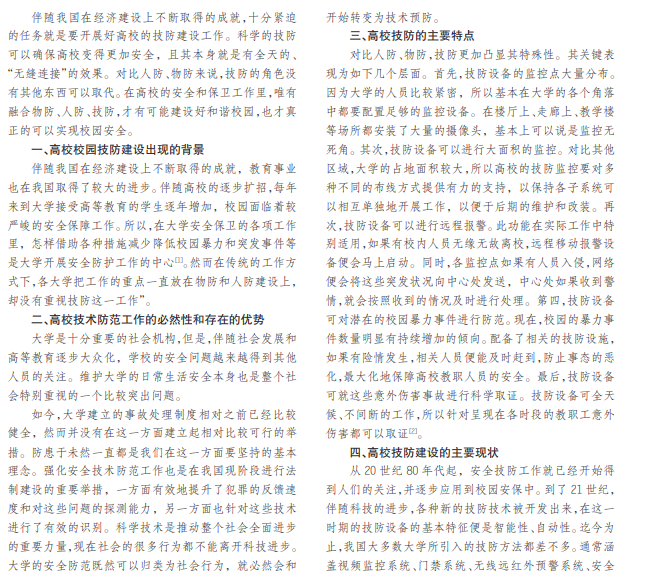 伴随社会的持续快速发展,高校技防建设工作变得越来越重要了。文章先是描述了高校技防工作的具体特 征、高校校园技防建设的背景,然后了解当下高校技防建设的基本情况,针对这一情况,最后给出了高校技防建设的今 后发展趋势。