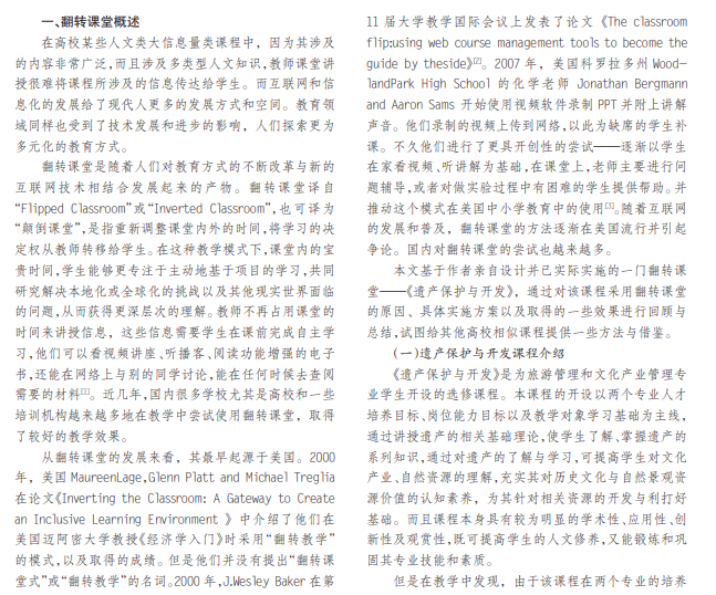 高等教学中经常会出现一些人文类大信息量的课程,这些课程很难通过传统教学方式完成教学内容和目 标。翻转课堂可借助网络平台和课下线上学习的方式让学生掌握更多的知识内容,可解决大信息量课程教学的难题。本 文以《遗产保护与开发》课程为例,介绍了作者在该课程翻转课堂的应用实践,以期能为此类大信息量课程的教学提供 一些思考与借鉴。