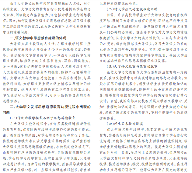 大学语文作为一门基础课程,对大学生的思想教育培养产生重要的作用。通过语文教学,可以弘扬传统文 化,培养学生的爱国精神、人文主义精神以及自强不息、艰苦奋斗的良好品质。本文将具体指出大学语文中思想教育功 能的体现,并分析当前大学语文思想教育功能发挥的过程中出现的问题,并提出解决措施。