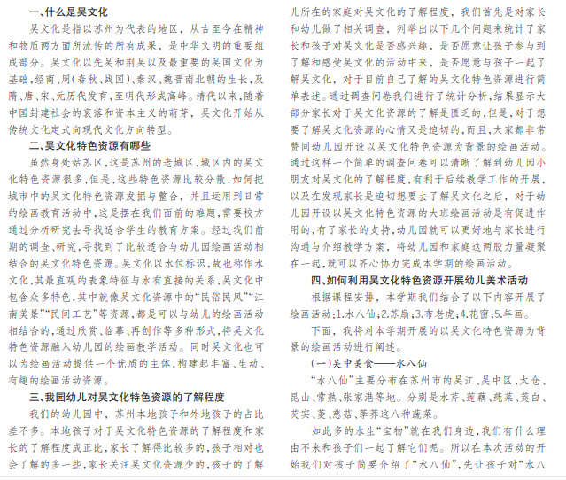 吴地是指以整个长江三角洲在内的大部分区域为主,以太湖流域为中心,以苏州、无锡、常州等城市为依托 的广大地区,其中以苏州最具有代表性。在这里,先民们依靠富饶的土地资源,创造了辉煌的历史文明,也造就了灿烂的吴 文化。吴文化是一种当地精神、物质、行为等诸多层面文化的总和,有着特殊的教育价值。吴文化的内涵以及它厚重深邃 的底蕴,是非常值得我们深度挖掘的。如何有效发掘吴文化特色资源中的美术元素,并且利用这些元素对幼儿园的小朋 友进行美术教学呢?我在实际工作中总结了一些自己的做法和想法。