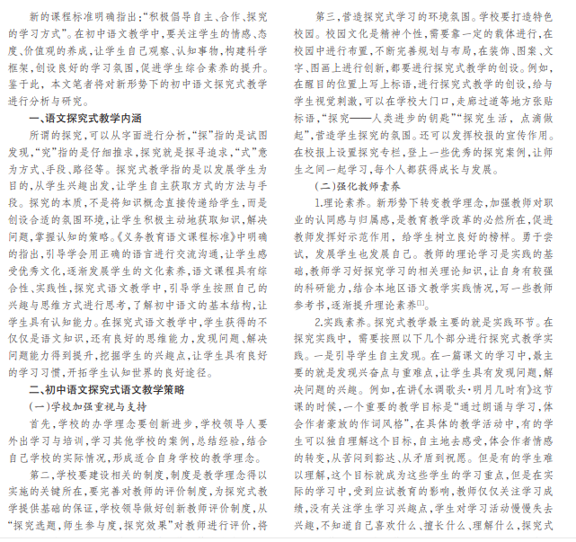 基础教育改革全面实施与开展,新的教学思想、教学方式逐渐出现,关于探究式教学的理论与实践也越来越 多。探究式教学在初中语文中的实践受到关注。鉴于此,本文将探讨新形势下初中语文教学中探究式教学实践进行分析。