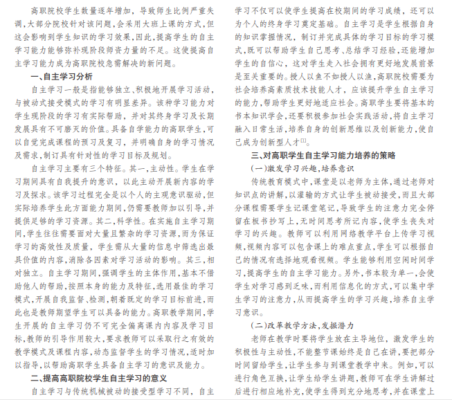 对高职院校学生自主学习能力的培养,需要学生自身、老师以及学校的共同努力。本文通过分析自主学习 及提高高职学生自主学习能力的现实意义,提出对学生意识、能力、学习目标以及习惯等方面的培养,旨在实现学生自 主学习。