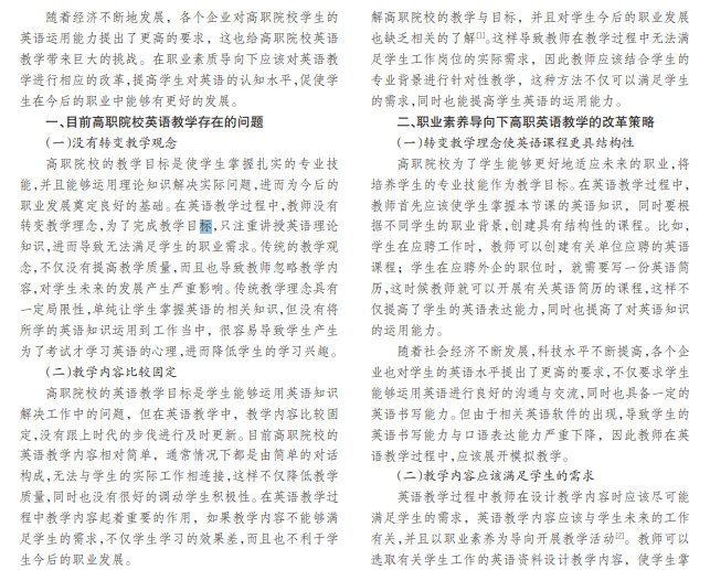 英语学科是高职院校重要的学习科目,对于学生的职业发展有着重要的影响。但目前绝大多数教师只关注 学生的成绩,因此在课堂中只注重英语知识的讲授,而忽略英语教学与学生未来的职业相结合。本文主要阐述了目前高 职院校英语教学存在的问题,并根据相关问题提出了高职英语教学改革的策略。