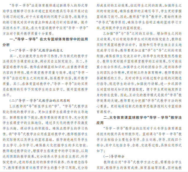 新课改的深化促进了大专体育篮球教学方法与内容的创新,打破了篮球示范、讲解、练习教学内容的束缚, 满足学生的学习需求。本文围绕“导学 -学导”这一新式教学方法,侧重对动作的解说与示范,创新教学方法,围绕导学、 学导等方面提升大专体育篮球教学效果,展示此方法在篮球教学中的可行性。