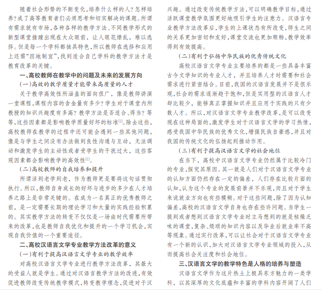 近年来,高校教育教学改革逐渐被大众所重视。而教育改革的关键应该是让其中的每一个人都能在科学、 适合、高效的教学方法下正向地成长和发展。结合社会发展的需要和教育改革的整体态势,应不断创新和改进高校汉语 言文学专业的人才培养模式,加强学生的创新意识和创新能力,提高综合素质。