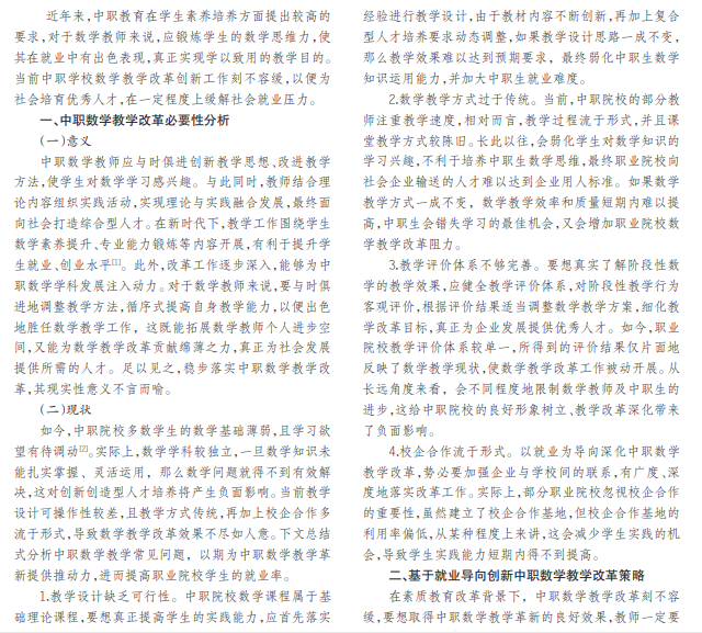 中职学校面向社会培养复合型人才,在实际教学中数学教师应适当创新教学方式,丰富学生知识储备,让 学生掌握理论与实践结合的技巧,真正满足新时期社会用人需求。本文首先介绍中职数学教学改革的意义及现状,然后 重点分析在就业导向视域下,中职数学教学改革的具体策略,旨在提高中职生就业率,取得中职数学教学改革成效。