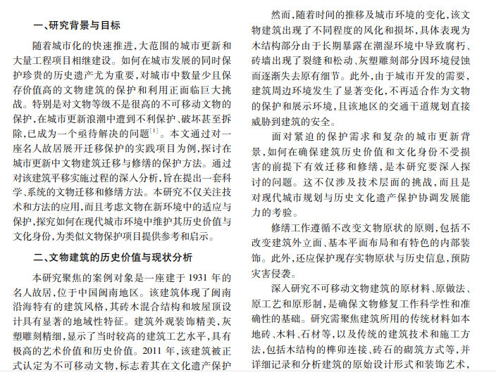 本文以某不可移动文物建筑的迁移与保护项目为例,评估文物的历史价值与现状、病害及病害成 因,论述病害诊断、迁移策略、保护修缮及其实施过程,提出一套系统的文物保护与修缮方法。该套方法不仅可 以确保文物建筑在迁移过程中结构的安全和历史面貌的完整,而且可以更好地保护和利用独具价值的历史文 化遗产。