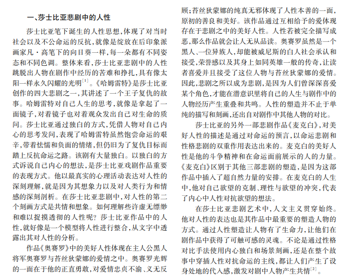 莎士比亚常在悲剧戏剧作品中思考和探究人性。莎士比亚悲剧中体现的人性包括美好人性和卑 劣人性以及双重人性,人性诞生的背景与莎士比亚的出身以及他所处的社会环境息息相关。当代影视戏剧作 品可借鉴莎士比亚作品中人性的表现方式,结合道具场景及世界观设定,表达现代人性观。
