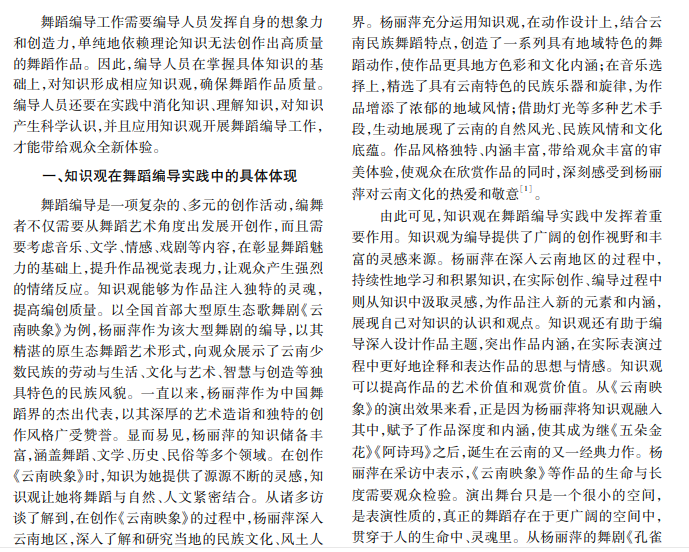 舞蹈编导人员不仅要具有较高的知识素养,而且要具备出色的知识观,才能确保舞蹈编导效果。 本文结合实际案例深入分析知识观在舞蹈编导实践中的作用,深入分析如何更好地获取知识观,展开高质量的 舞蹈编导工作,并确保知识观得到充分构建。
