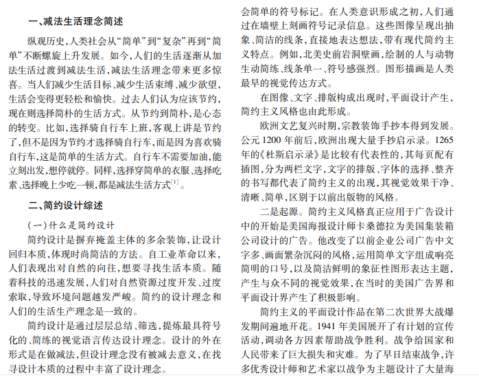 本文通过对减法生活理念的行为分析和简约主义在历史中的发展,分析图形的符号化设计、色彩 概括、构图与恰当留白,舍弃与主题视觉无关的元素,提炼具有符号化的简约视觉语言,探究在减法生活理念下 简约的图形设计,传达减法生活理念。