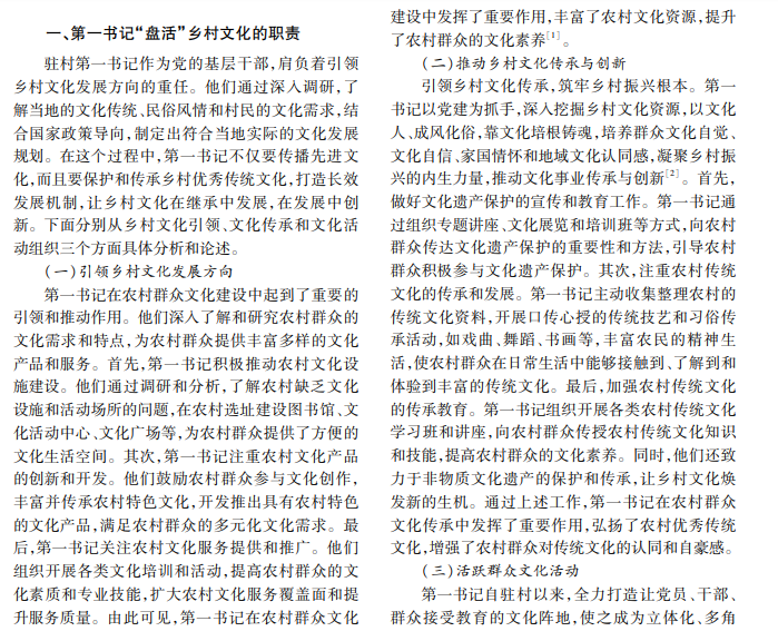乡村振兴,既要塑形,又要铸魂。文化是乡村赓续发展的灵魂。乡村文化资源丰富,但一直没有得 到重视和开发。乡村思想观念滞后,缺乏文化保护机制,导致乡村文化传承与创新不足。在乡村振兴战略大背 景下,本文探讨第一书记对乡村文化振兴的作用、面临的困境及实践路径,旨在更好地发挥第一书记的作用,推 动乡村文化全面进步与发展。