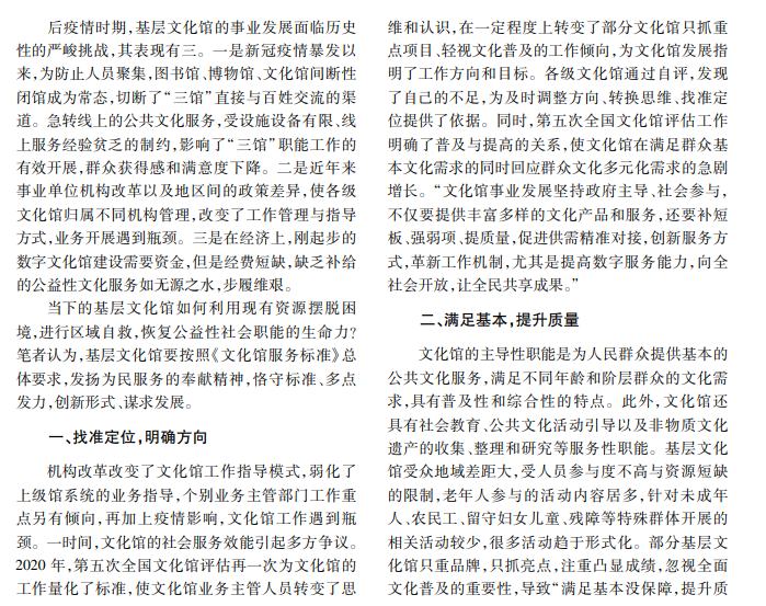 文化馆是群众文化建设的主阵地,是完善现代公共服务体系的中坚力量。基层文化馆应按照《文 化馆服务标准》的总体要求,发扬为民服务的奉献精神,恪守标准、多点发力、创新形式,谋求高质量发展。本文 针对基层文化馆现状,从工作方向、服务效能、资源利用、制度保障四个方面提出建议。
